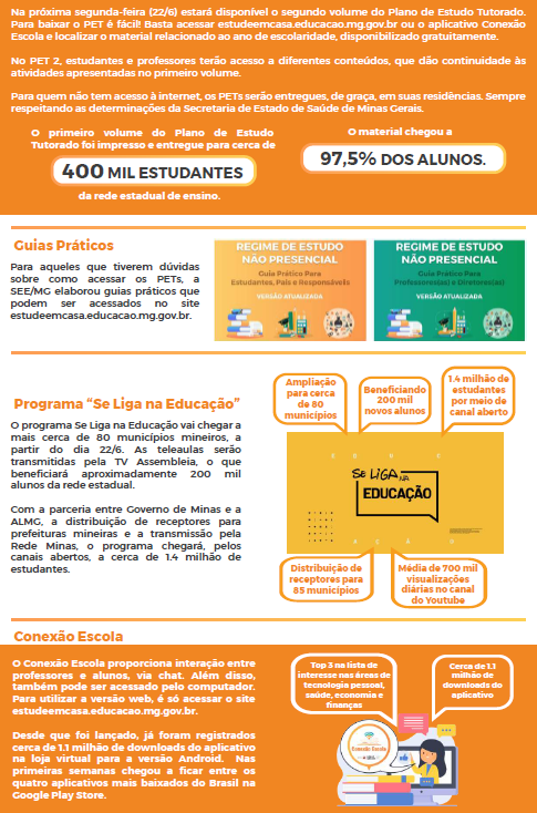 A experiência do Regime de Estudo não Presencial implementado em Minas Gerais tem sido acompanhada de perto e com muita atenção por outros estados e municípios. As ferramentas desenvolvidas pela Secretaria de Estado de Educação de Minas Gerais (SEE/MG), com a ajuda de professores da rede e em regime de colaboração com a União Nacional dos Dirigentes Municipais de Educação (Undime-MG), além das universidades mineiras, têm servido de exemplo e gerado curiosidade pedagógica e logisticamente.